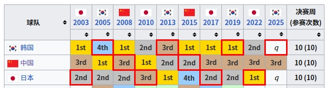 07月15日讯 2025东亚杯收官,第三轮中国队1-0战胜中国香港队,最终排名第三。这是第10届东亚杯,国足从未在东亚杯垫底,最好的成绩是2005年以及2010年两次夺冠。2025东亚杯(第三,进1球丢5球)韩国3-0中国日本2-0中国中国1-0中国香港2022东亚杯(第三,进1球丢3球)中国0-3韩国日本0-0中国中国1-0中国香港2019东亚杯(第三,进...